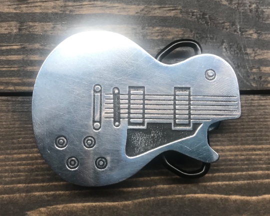 Les Paul Guitar Shape Belt Buckle Made of Polished Metal Buckle Dimensions:- 3.6" wide by 2.2" tall - Cut from 0.188" thick aluminum plate- Allows up to a 1.75" wide beltEach...